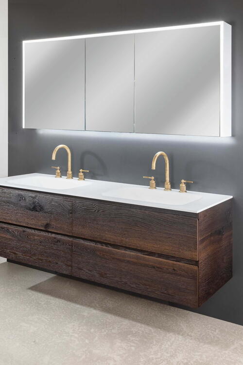 Seda Badmöbel mit thermogeformten Corian-Abdeckungen bieten absolute Hygiene durch fugenlose Integration des Beckens – keine Übergänge, keine Schmutzecken. Corian ist reparierbar und durchgefärbt. Alle Badmöbel werden in unserer Schweizer Manufaktur mit über 60 Jahren Erfahrung nach Mass gefertigt. Kombinierbar mit Unterschränken in Furnier, Hochglanzlack oder modernen Kunstharzdekoren. Schweizer Präzision für exklusive Badezimmer.