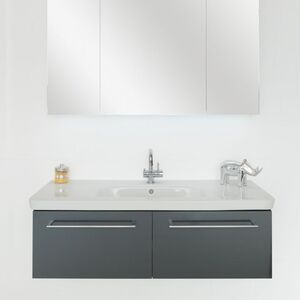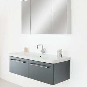 Relief: Fronten Relief mit schwarzer MDF-Trägerplatte, Korpusseiten in MDF schwarz mit Relief, Seiten und Fronten seitlich in Gehrung (Bei Keramikwaschtisch-Unterbauten auf Anfrage) Griffleisten im passenden Holz glatt furniert (gegen Mehrpreis)