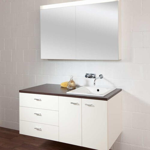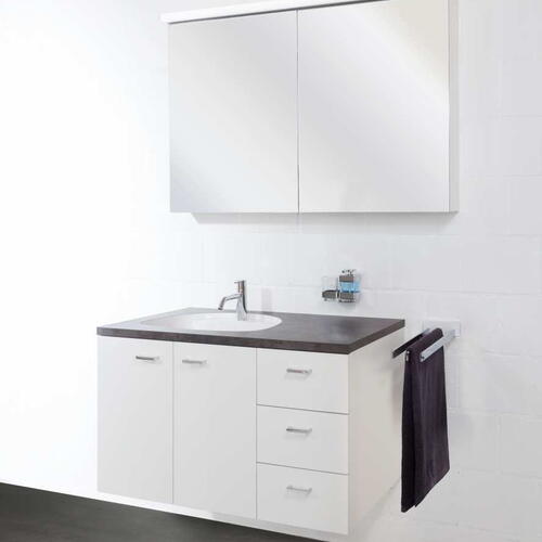 Incaso Standard est notre gamme classique de meubles de salle de bains pour lavabos encastrés, offrant une excellente optimisation de l'espace. Ces meubles-lavabos séduisent par leur fonctionnalité bien pensée et leur design intemporel. Avec une large gamme de façades mélaminées disponibles dans plus de 30 décors – du blanc aux imitations bois modernes –, vous trouverez le style parfait pour votre salle de bains. Les caissons robustes offrent un espace de rangement maximal avec des agencements intérieurs modulables. Les portes et les tiroirs peuvent être combinés de manière flexible, tandis que les ferrures à fermeture douce garantissent une fermeture en douceur. Tous les meubles standard Incaso peuvent être fabriqués sur mesure et s'adaptent parfaitement à votre lavabo encastré et à la configuration de votre pièce.
