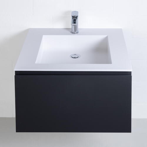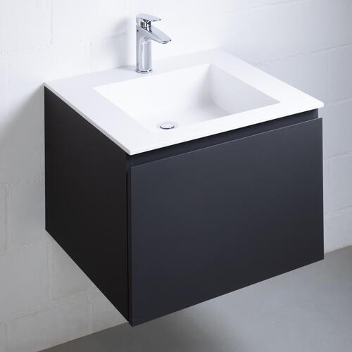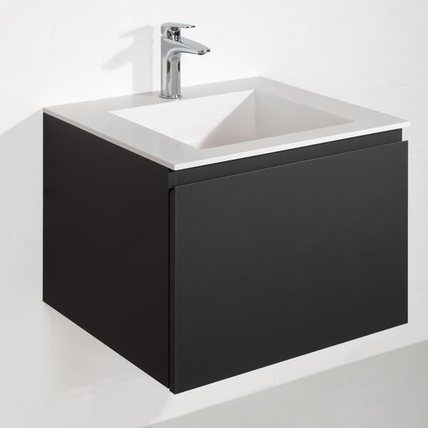 Relief : Faces en MDF noir avec placage Relief, côtés en MDF noir plaqués Relief, chants des côtés et des faces coupés à l’onglet (sur demande pour les meubles sous tables en céramique), profils de poignée plaqués bois massif dans le bois correspondant