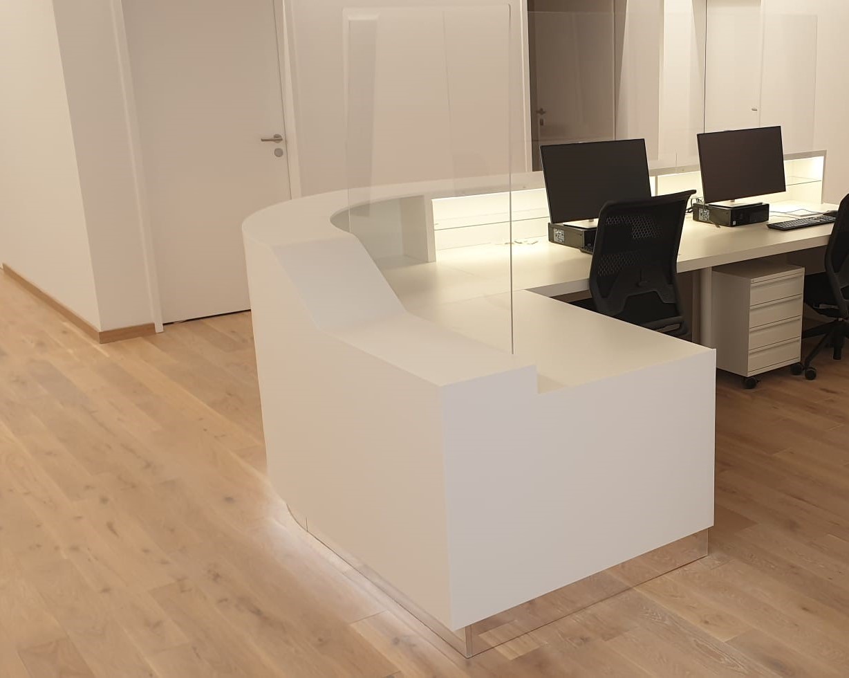 Pour le Centre Médical Sanamea à Bâle, nous avons eu le plaisir de réaliser ce comptoir rond sur mesure en Corian©. Sa forme courbée et sa finition sans joint confèrent au comptoir un aspect moderne et élégant, parfaitement intégré à l'espace.