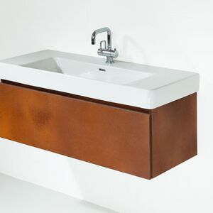 Relief : Faces en MDF noir avec placage Relief, côtés en MDF noir plaqués Relief, chants des côtés et des faces coupés à l’onglet (sur demande pour les meubles sous tables en céramique), profils de poignée plaqués bois massif dans le bois correspondant